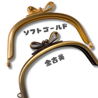 リボン型のゲンコが可愛い口金です♪横幅10cmゲンコを除いた高さ5.7cm本体色:金古美/ソフトゴールド↓型紙はこちら♪(Basket's STORE様)↓作品画像提供者*みるくるみ日和様*